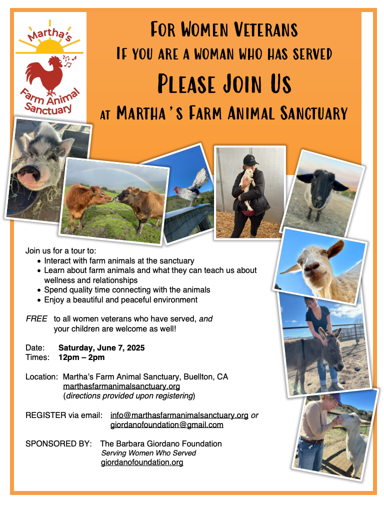 If you are a woman who has served please join us at Martha’s Farm Animal Sanctuary for a free sanctuary tour event. FREE to all women veterans who have served, and your children are welcome as well!